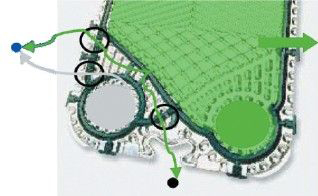 雷曼可拆式板式換熱器采用了精確的多點定位系統(tǒng)。角孔直徑100mm以下型號的四角定位系統(tǒng),讓板片以上下導(dǎo)桿為軸心精確嵌合在一起。角孔直徑150mm以上型號的五點定位系統(tǒng),讓板片的定位是以多個金屬與金屬接觸點而確定,其中上導(dǎo)桿的接觸點,可以防止板片上下移動,下導(dǎo)桿的接觸點可限制板片不會左右移動。采用多點定位技術(shù),讓板片組既可以在導(dǎo)桿上沒有阻力的前后移動,輕松簡單的完成維護作業(yè),又可以在復(fù)裝時讓板片精確嵌合,讓墊片密封準(zhǔn)確,絲毫不差,板片組達到完全復(fù)位,從而保證了換熱器拆裝后壽命也耐久。而且具有多點定位系統(tǒng)的板式換熱器只需要一個人,即使沒有任何經(jīng)驗,用簡單的工具就可輕易的拆裝換熱器。